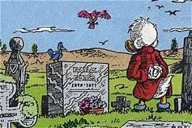 Joakim kikker på Clementine's gravsten i Don Rosa's serie, Milliardæren fra Ødelyng Overdrev.